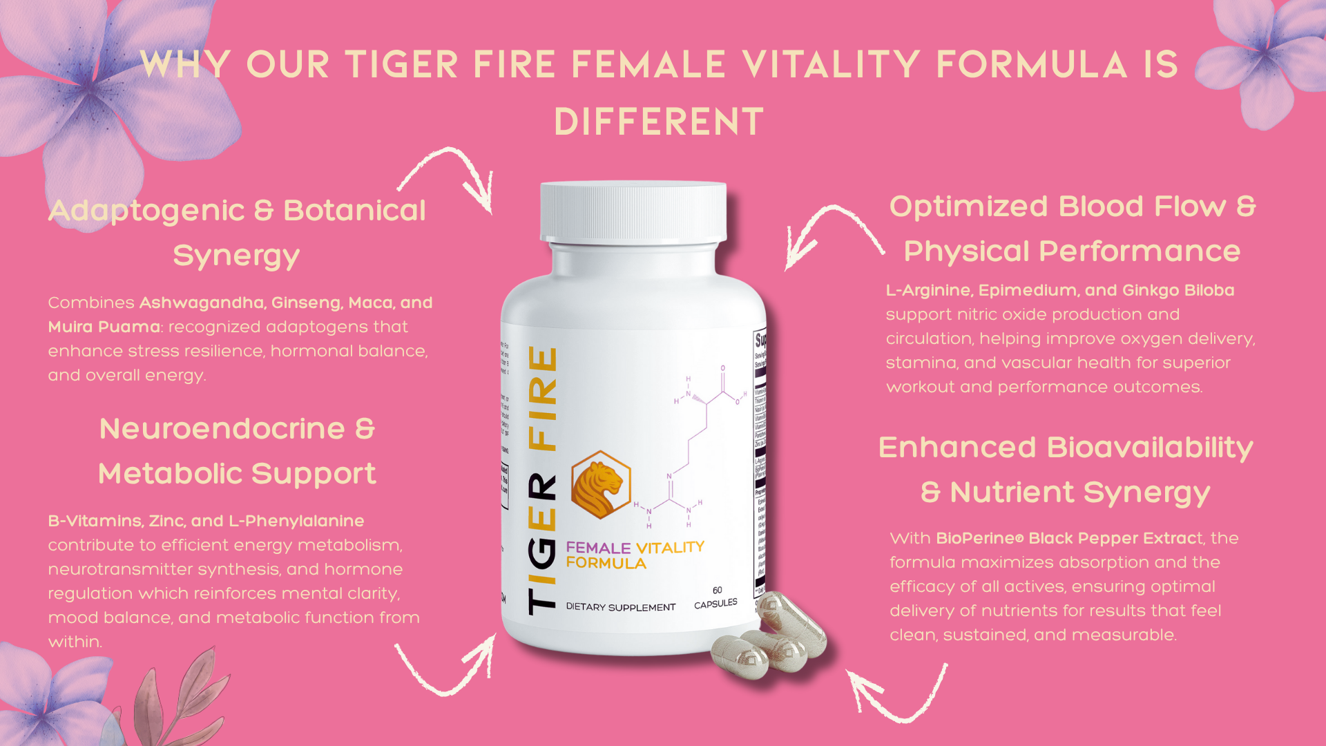 Our Female Vitality Formula is a precision-engineered adaptogenic and nutrient complex that supports hormonal balance, cognitive clarity, and sustained energy, combining botanicals like Ashwagandha, Maca, Dong Quai, Ginseng, Ginkgo, and L-Arginine with BioPerine® for optimized absorption to fuel performance, focus, and resilience.*