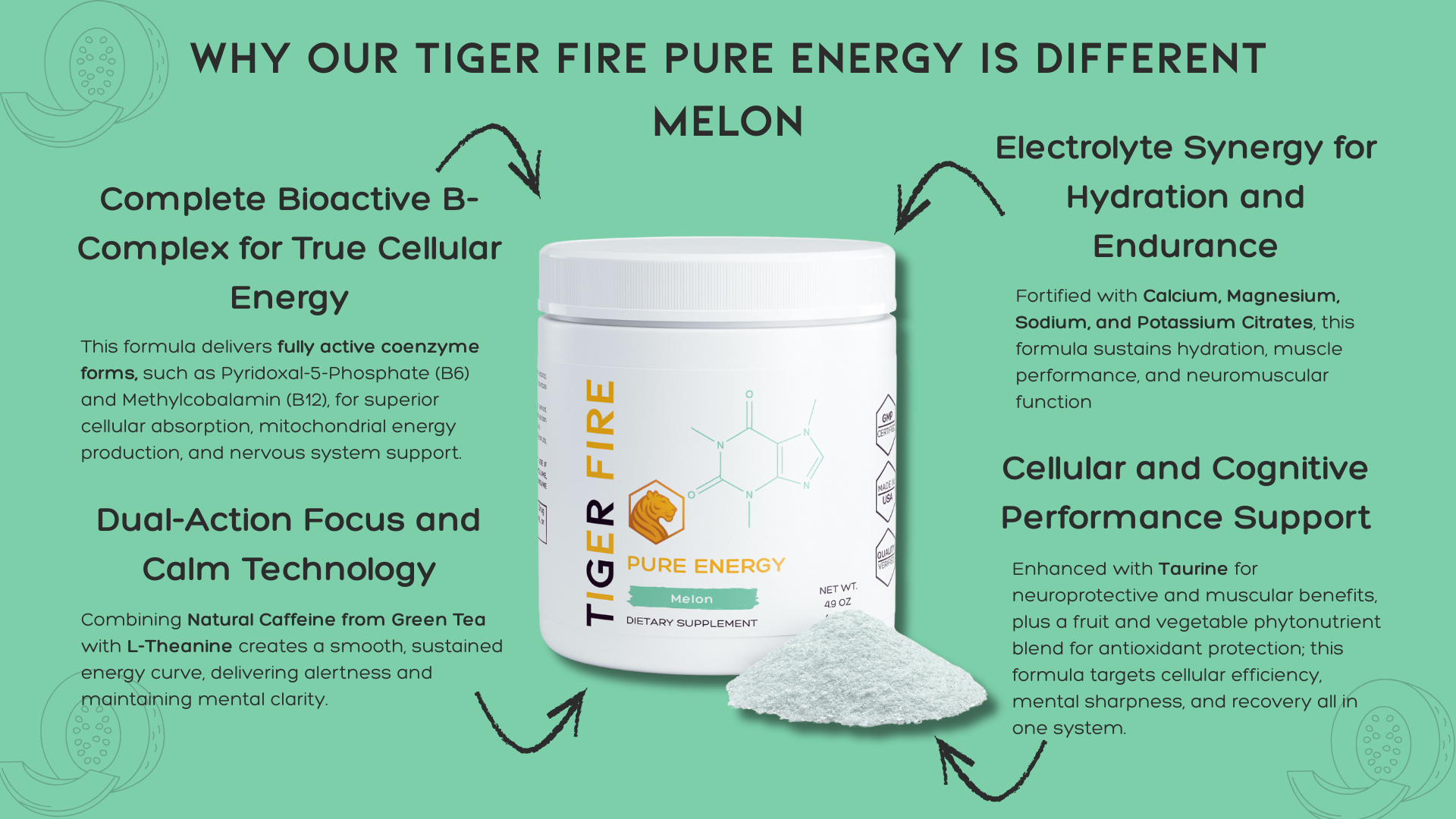 - B-vitamins and electrolytes work together to support cellular energy production, hydration, and sustained performance throughout the day.