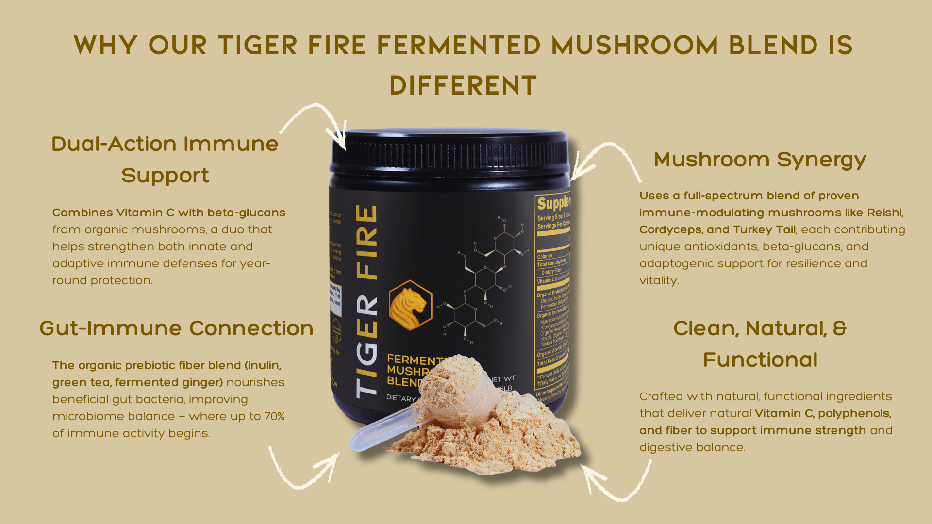 Vitamin C, Organic Prebiotic Fiber Blend (Organic Inulin, Organic Green Tea Extract, Organic Fermented Ginger Root), Organic Immune Blend (Mushroom Mycelial Biomass Blend,[Cordyceps (Cordyceps militaris), Reishi (Ganoderma lucidum), Himematsutake (Royal Sun Agaricus) (Agaricus blazei), Shiitake (Lentinula edodes), Maitake (Grifola frondosa), Turkey Tails (Trametes versicolor)], Acerola Cherry Extract, Total Beta Flucan (from Organic Immune Blend), Organic Cassava Maltodextrin.