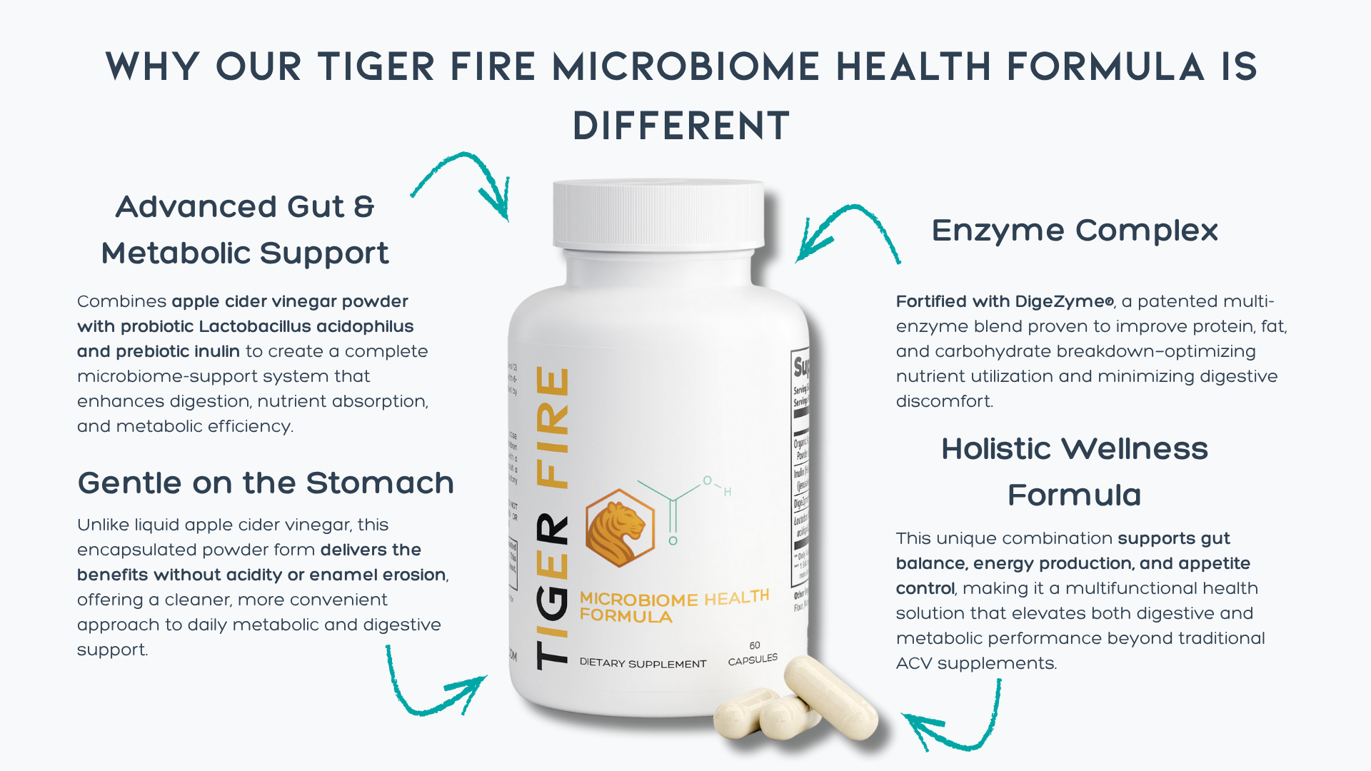 Our Microbiome Health Formula strengthens the gut-brain-immune axis with a precise blend of Apple Cider Vinegar, Inulin, probiotics, and enzymes. Allowing optimization of digestion, energy, and metabolic balance for sharper focus, smoother digestion, and total body performance from the core.*