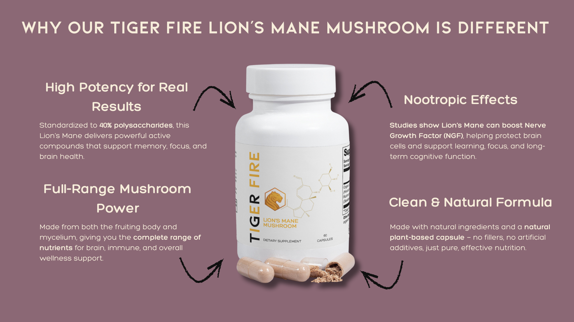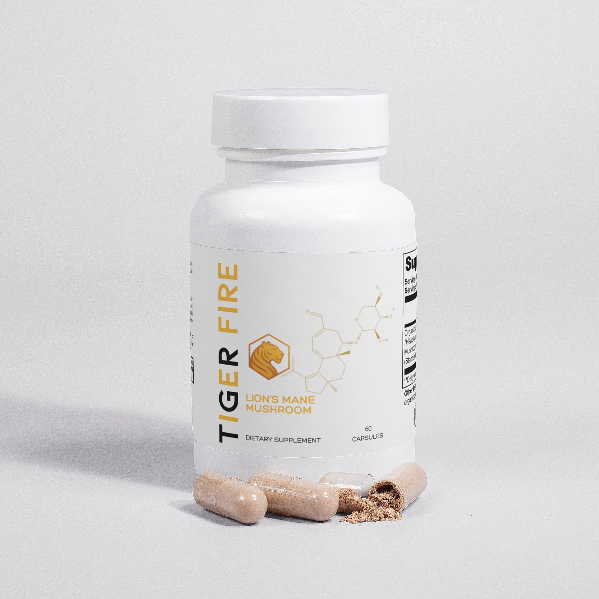 Organic Lion’s Mane (Hericum erinaceus) Mushroom Fruiting Body & Mycelium Powder (Standardized to 40% polysaccharides [400mg]), Organic capsule (pullulan, water), organic pea starch.